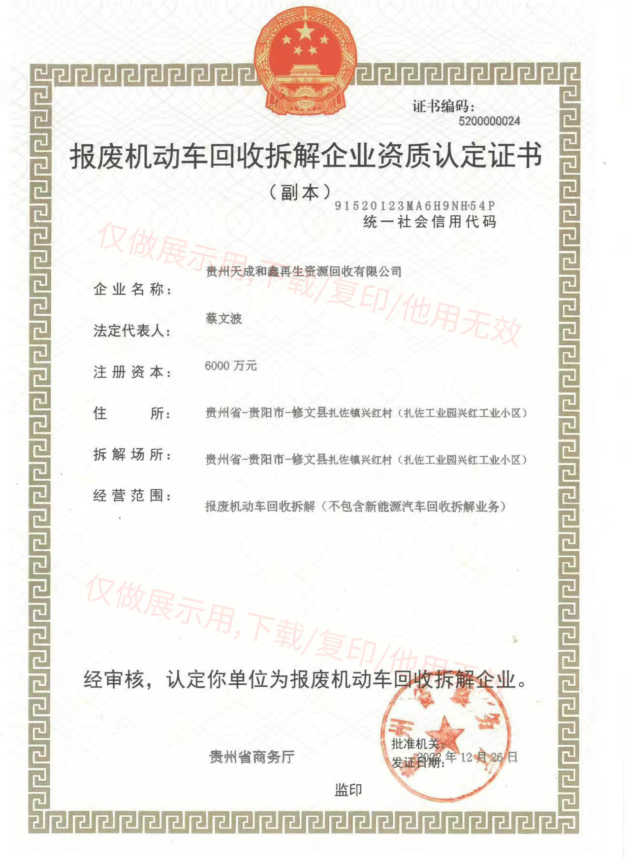 貴州天成和鑫再生資源回收有限公司是一家經(jīng)貴州省商務(wù)廳認定資質(zhì)的報廢汽車回收拆解企業(yè),公安車管接入專網(wǎng),直接辦理銷戶手續(xù)。